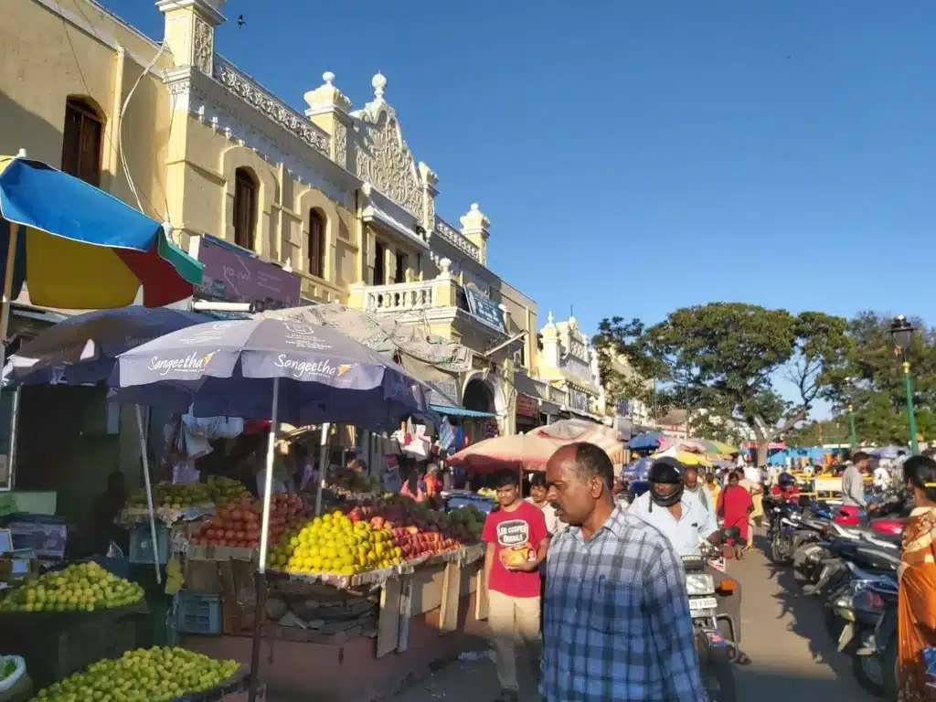 שוק תוסס וצבעוני עם דוכני פירות וירקות, כלי מטבח, קטרות בעבודת יד, פרחים ועוד. אחד השווקים הכיפיים בדרום הודו!